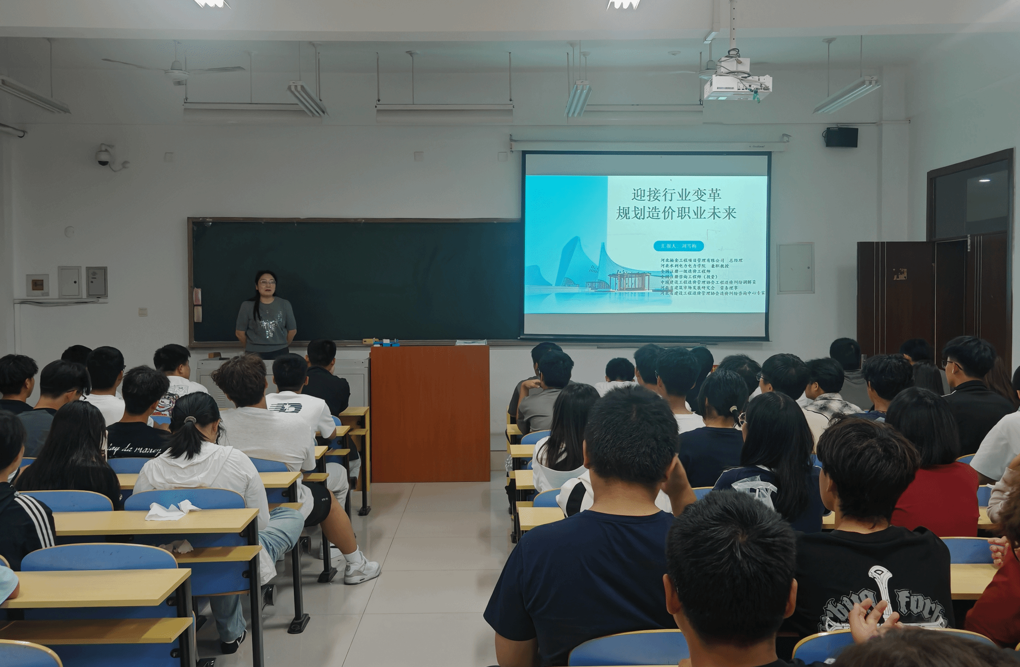 为助力 2025 级工程造价专业新生快速融入大学生活、找准专业学习方向、应对行业发展新趋势,9 月25日,“迎接行业变革,规划造价职业未来-2025 级工程造价新生入学教育”专题讲座在 4B511 举行。讲座由工程造价与房地产教研室副主任吴佳丽主持,河北柏金工程项目管理有限公司刘雪梅总经理主讲,2025 级造价专业全体新生参与,现场氛围热烈。